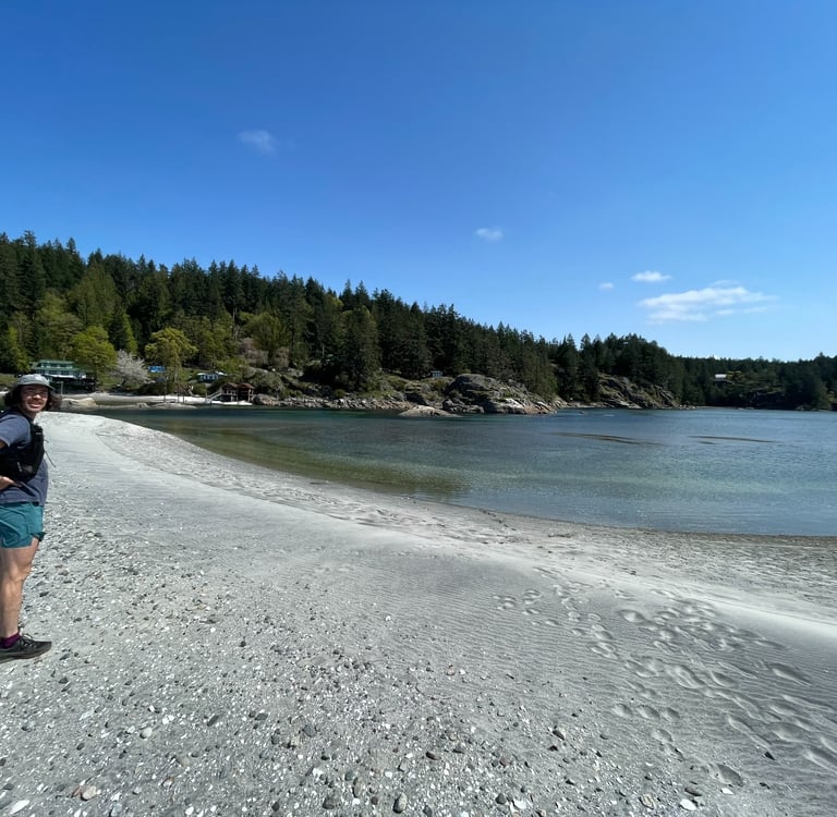 Hornby is the one that gets under your skin. The single track through Mt. Geoffrey Regional Park is legitimately excellent — technical enough to keep you honest, with enough canopy to make you forget you're on an island. From there the route drops to Tribune Bay for beach running and a well-earned lunch stop, before finishing at Helliwell Provincial Park where blufftop trails deliver sweeping, open views across the Salish Sea to the mainland mountains. Hornby has a distinct energy — artists, old hippies, serious gardeners. The island feels lived-in and unique in a way that's hard to articulate but impossible to miss.