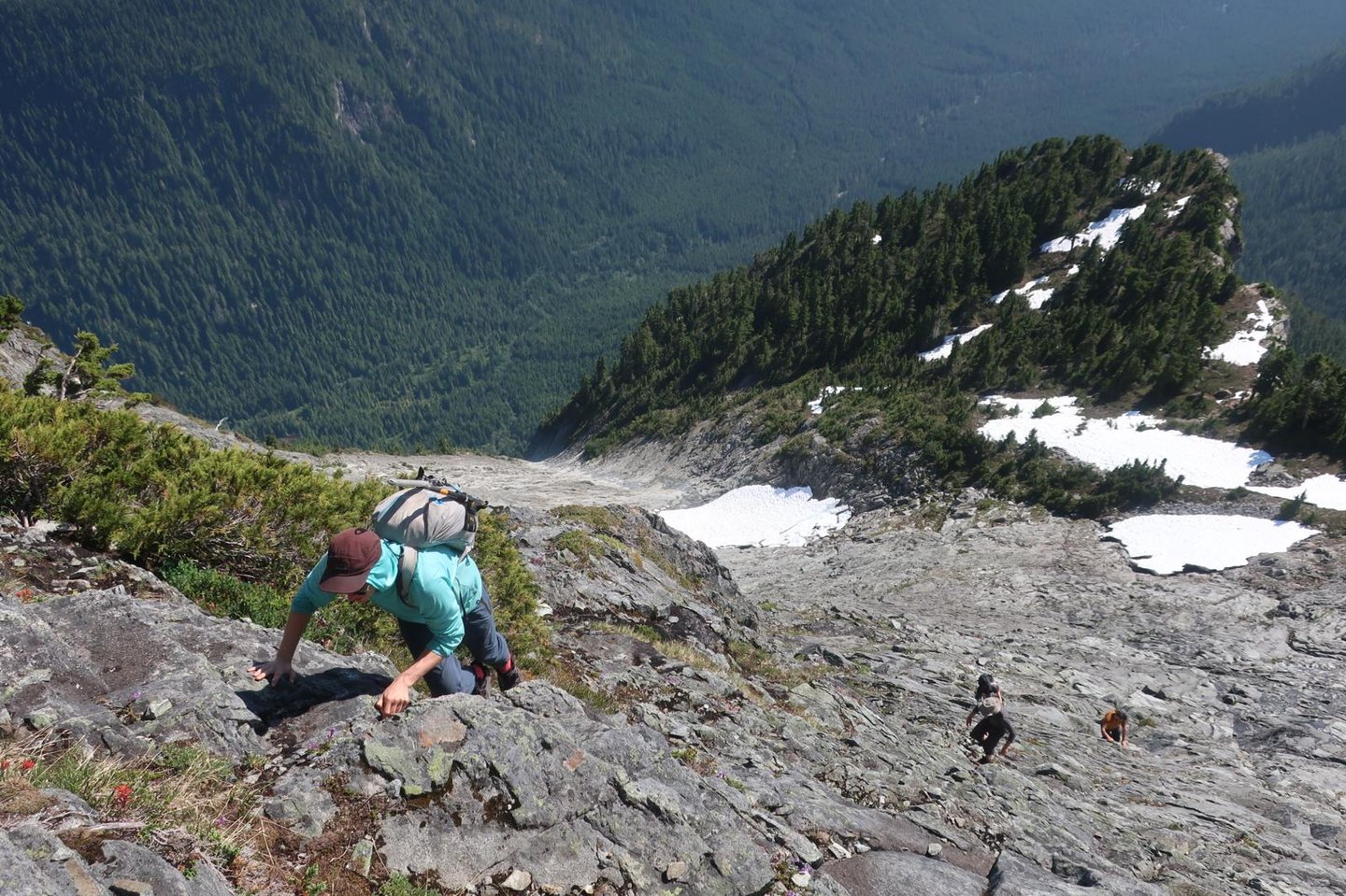Onwards and upwards we went, working the west ridge, and wrapping our way onto the south face, where we found ourselves on beautiful granite slabs. It was steep, but given our backround in climbing, and our inappropriate footwear, we all felt comfortable meandering up the ledges. Eventually we did find the ramp, and hoped on the express route, splitting the slabs and making our way to the south ridge, where we navigated the last few blocks to the summit.
