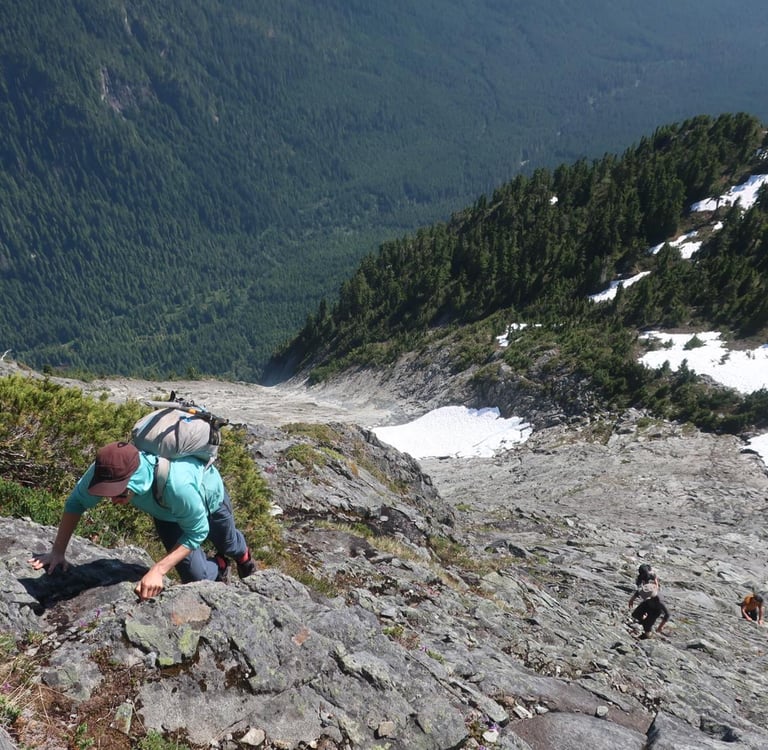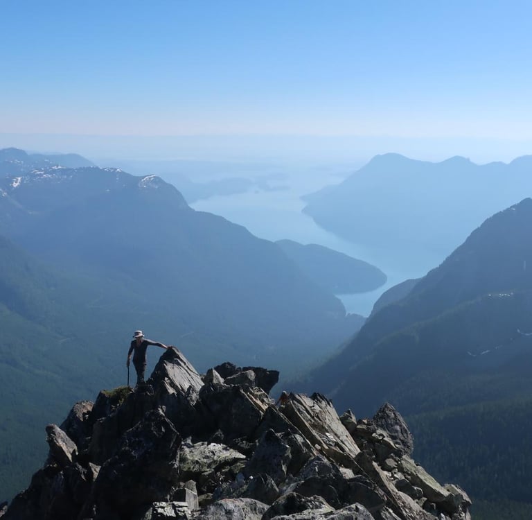 Well for me, the answer was easy. i had spent the entire summer staring up at the iconic, pyramid shaped peak of Mt. Denman. Everyday i would come around Sarah Point, the entrance to Desolation sound, and look longingly up at that west ridge, picturing the bomber granite sidewalk i had heard rumour of. What i wasn't picturing of course was the hours of heinous bushwhacking to get there.