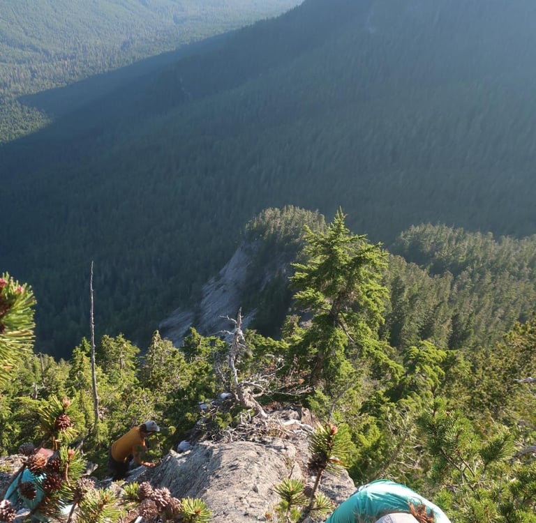 We had done a little preliminary research before leaving, and we knew of a few parties who had trail blazed this route over the year. But it wasn't until we broke out into the sub alpine that we saw any sign of a trail at all. Finally, there it was; a single piece of orange flagging, telling us that yes, in fact, someone else had been here before us, and someone else had ripped their legs to shreds on blueberry bushes in this exact spot.